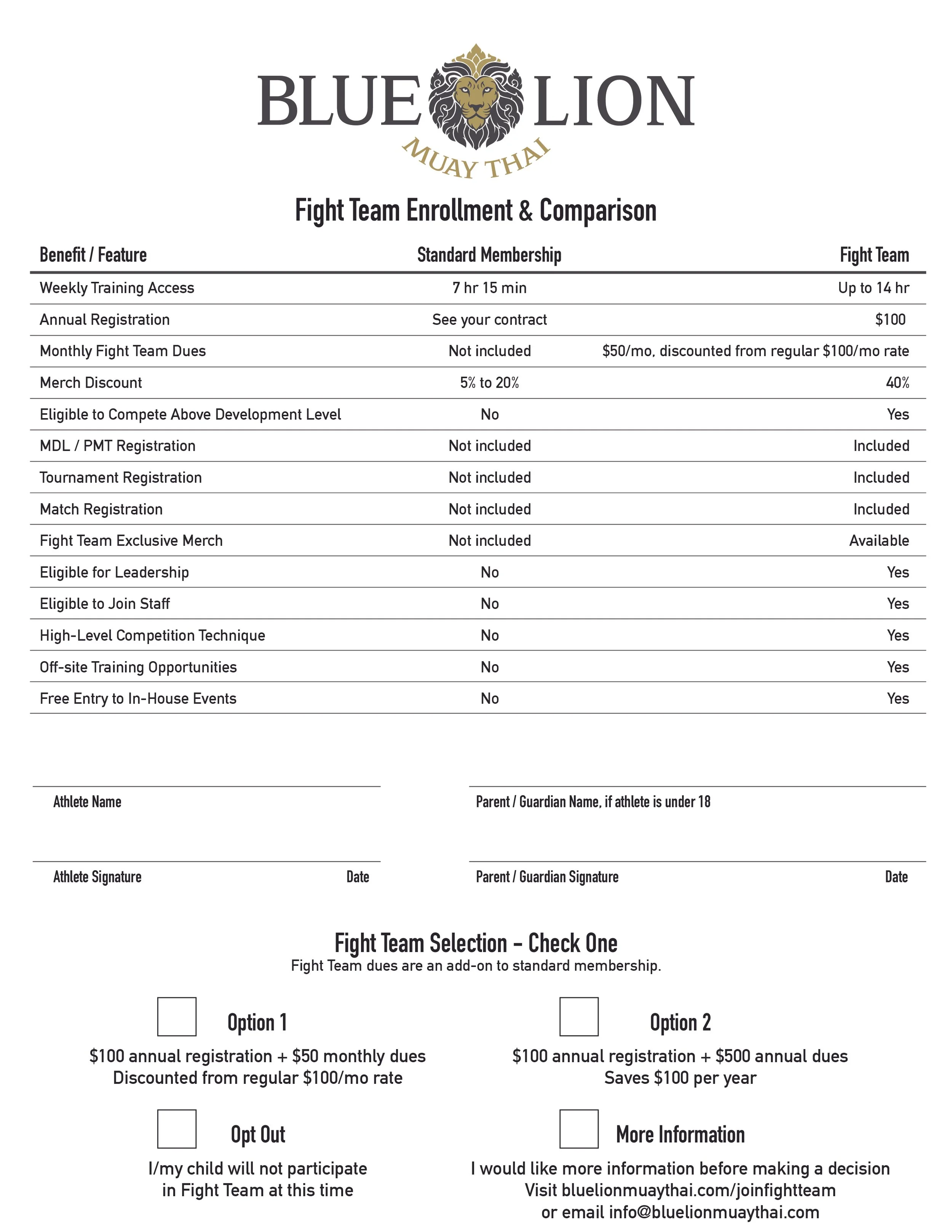 Members must maintain an active standard Blue Lion membership in order to participate on Fight Team.